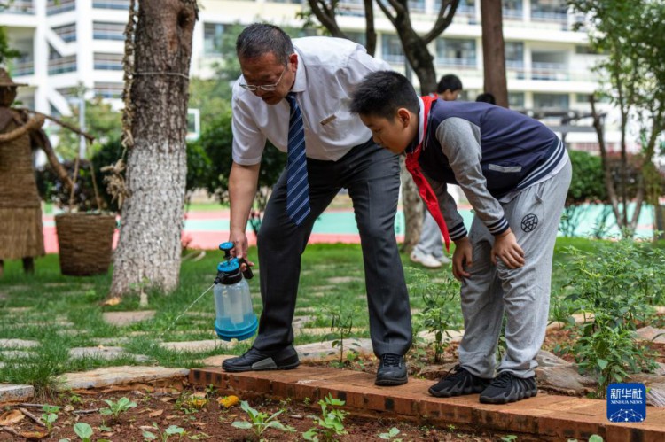 8月27日,云南省昆明市潤城學(xué)校的老師和學(xué)生在勞動體驗實踐基地給菜地澆水。