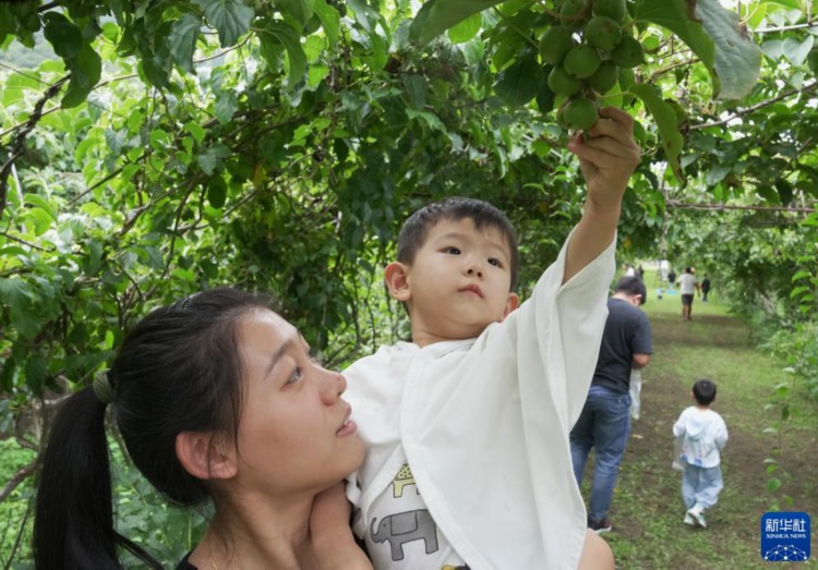 8月26日,游客帶著孩子在秦皇島市海港區(qū)駐操營鎮(zhèn)花廠峪村軟棗獼猴桃種植基地采摘軟棗獼猴桃。