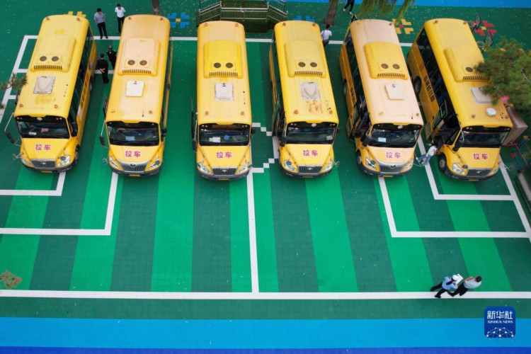 8月27日,石家莊市公安局藁城分局交通警察大隊民輔警在海英幼兒園對校車進行安全檢查(無人機照片)。