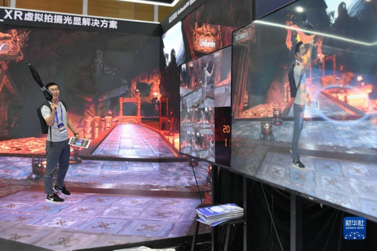 9月7日,在“2023世界顯示產業大會新型顯示創新成果展”現場,觀眾體驗XR虛擬拍攝系統。