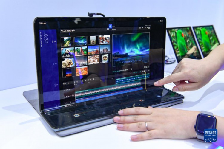 9月7日,在“2023世界顯示產業大會新型顯示創新成果展”現場,工作人員在展示京東方17.3"X-Fold十字折疊OLED。