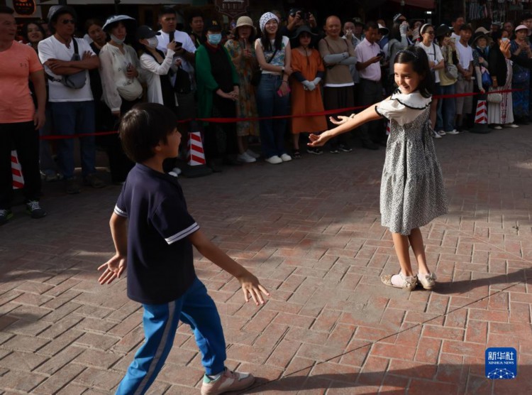 在新疆喀什古城景區內,兩名小朋友在隨音樂起舞(9月7日攝)。