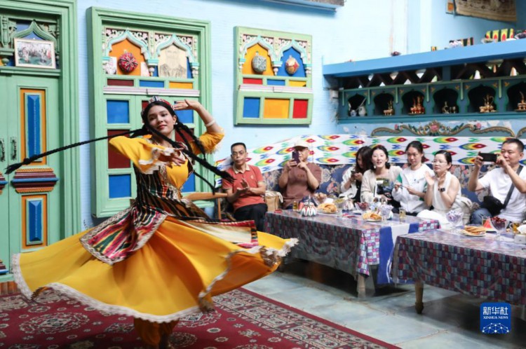 在新疆喀什古城景區“古麗的家”旅游家訪點,演員在隨音樂起舞(9月7日攝)。