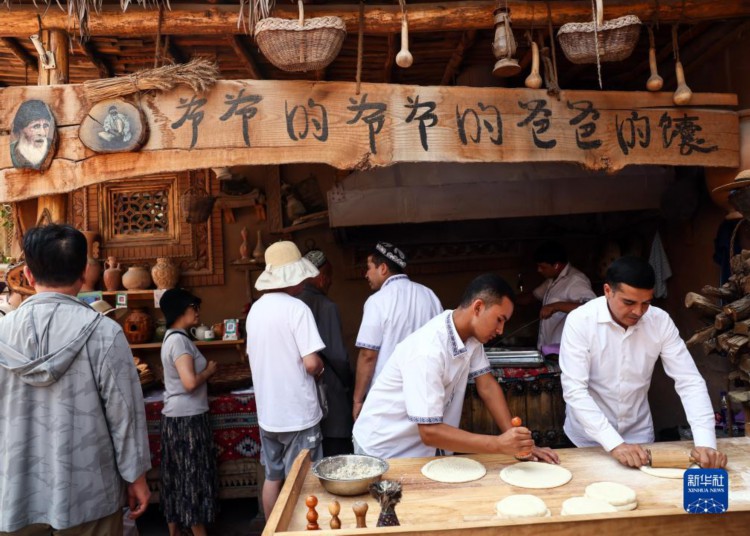 在新疆喀什古城景區(qū)“爺爺?shù)臓敔數(shù)陌职值拟巍贝蜮蔚辏ぷ魅藛T在制作馕坯(9月7日攝)。
