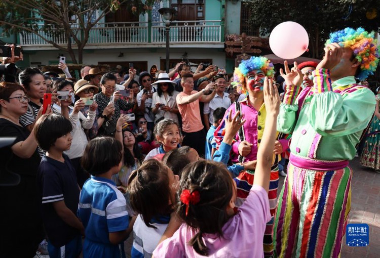 在新疆喀什古城景區內,演員與小朋友們互動(9月7日攝)。