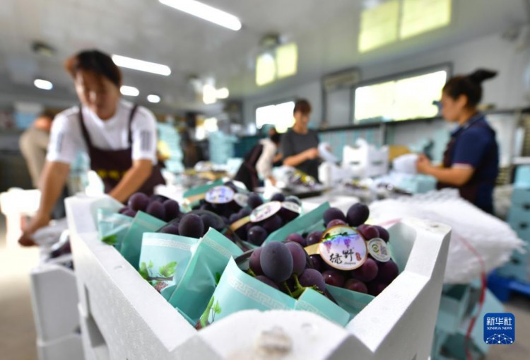 9月11日,在燈塔市古城街道康家臺村,葡萄種植戶在給葡萄打包裝箱。 近日,遼寧省燈塔市種植的遼峰葡萄喜迎豐收。燈塔市出產的遼峰葡萄遠近聞名,目前種植面積約1萬畝。當地已形成葡萄培育、種植、銷售、倉儲、加工相關產業鏈,葡萄是當地農民致富增收的特色產業。 新華社記者楊青攝