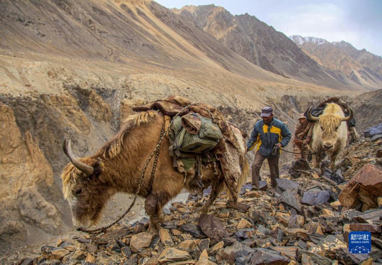 2013年9月28日,拉齊尼牽著牦牛在陡峭的邊境線上巡邏。新華社發(王烈 攝)