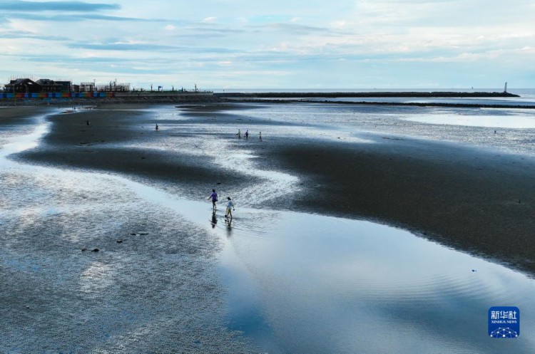 9月16日,游客在啟東“十里海灣”灘涂上游玩(無人機照片)。
