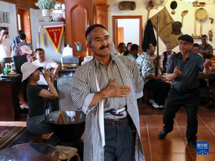 在新疆喀什古城百年老茶館內,人們隨音樂起舞(9月7日攝)。