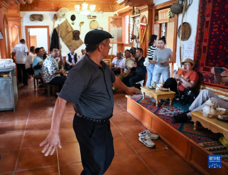 在新疆喀什古城百年老茶館內,人們隨音樂起舞(9月7日攝)。