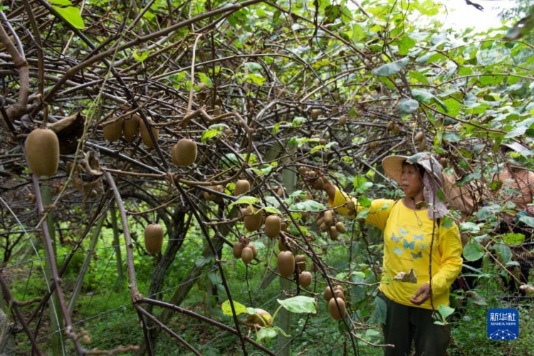 9月20日,湖南省永州市藍(lán)山縣所城鎮(zhèn)舜源村獼猴桃種植基地,當(dāng)?shù)毓r(nóng)在采摘獼猴桃。