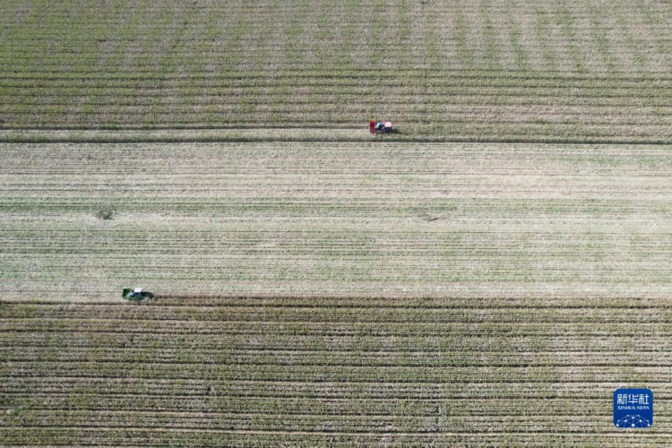 9月21日,在張掖市甘州區沙井鎮五個墩村,玉米收獲機在啟動儀式現場收割制種玉米(無人機照片)。