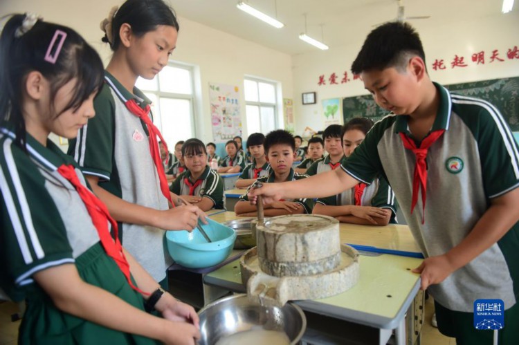 9月21日,滄州市新華區(qū)榮官屯小學的小學生在研磨豆?jié){。 當日,河北滄州市新華區(qū)榮官屯小學舉辦“校園豐收節(jié)”,旨在培育學生正確的勞動價值觀,讓學生在豐富的活動中體會到勞動之美、豐收之樂。 新華社記者 王民 攝