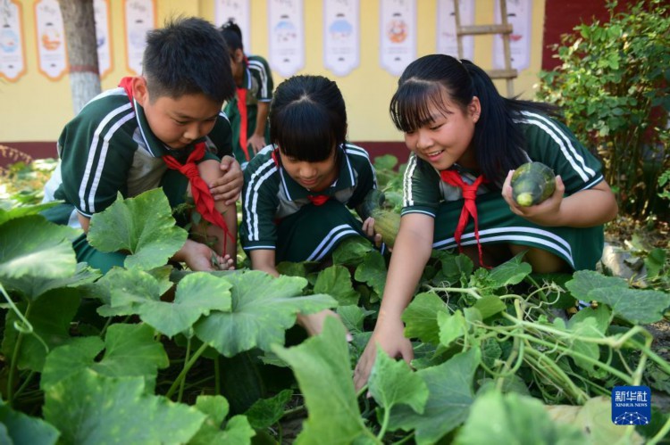9月21日,滄州市新華區(qū)榮官屯小學的小學生在校園里采摘。 當日,河北滄州市新華區(qū)榮官屯小學舉辦“校園豐收節(jié)”,旨在培育學生正確的勞動價值觀,讓學生在豐富的活動中體會到勞動之美、豐收之樂。 新華社記者 王民 攝