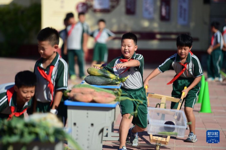 9月21日,滄州市新華區(qū)榮官屯小學的小學生進行果蔬運輸比賽。 當日,河北滄州市新華區(qū)榮官屯小學舉辦“校園豐收節(jié)”,旨在培育學生正確的勞動價值觀,讓學生在豐富的活動中體會到勞動之美、豐收之樂。 新華社記者 王民 攝