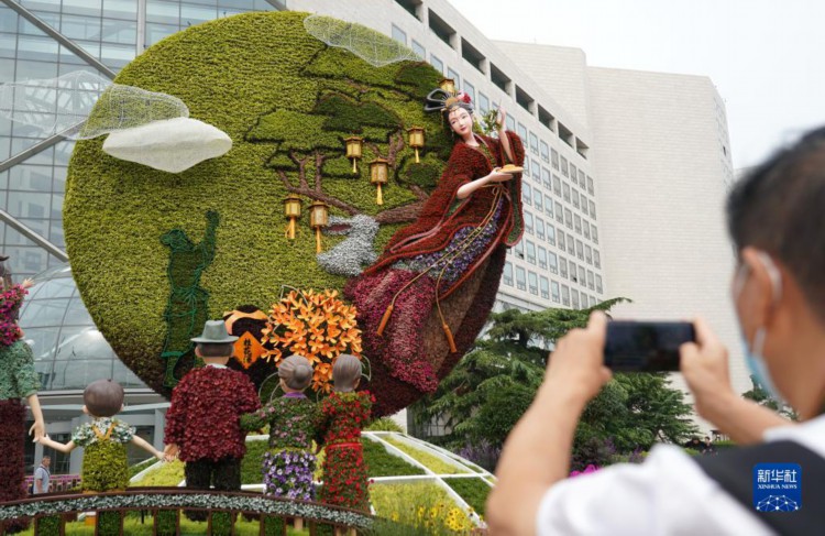 9月25日,市民在北京西單一處花壇前拍照。 中秋及國慶節假期日益臨近,北京天安門廣場的“祝福祖國”巨型花籃及長安街沿線立體花壇精彩亮相,吸引游人及市民觀賞留念。 新華社記者 張晨霖 攝