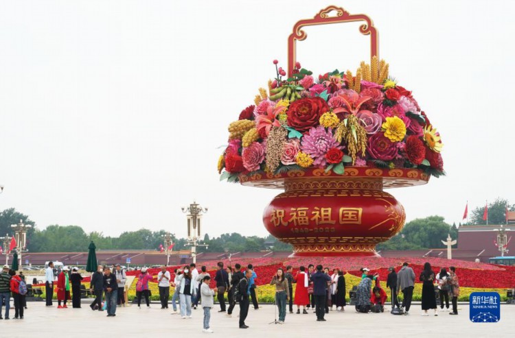 這是9月25日在北京天安門廣場拍攝的“祝福祖國”巨型花籃。 中秋及國慶節假期日益臨近,北京天安門廣場的“祝福祖國”巨型花籃及長安街沿線立體花壇精彩亮相,吸引游人及市民觀賞留念。 新華社記者 任超 攝