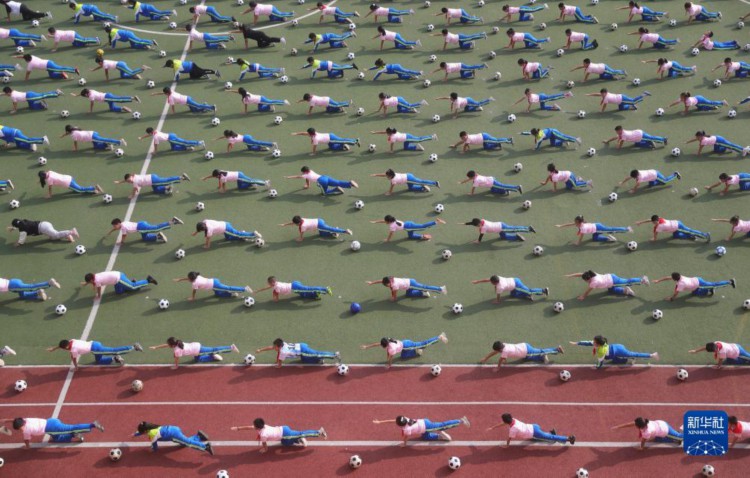 9月26日,河北省秦皇島市海港區(qū)耀華小學(xué)的學(xué)生在大課間練習(xí)足球操。