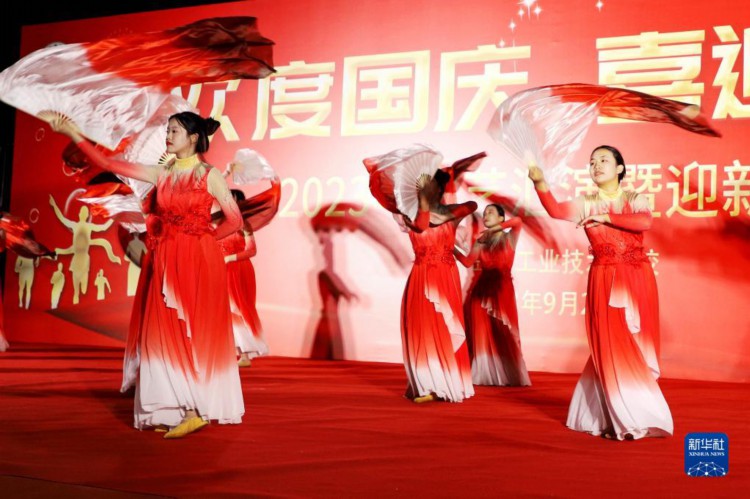 9月26日,學生在山東省青島市工業技術學?!坝瓏鴳c”主題晚會上表演舞蹈。