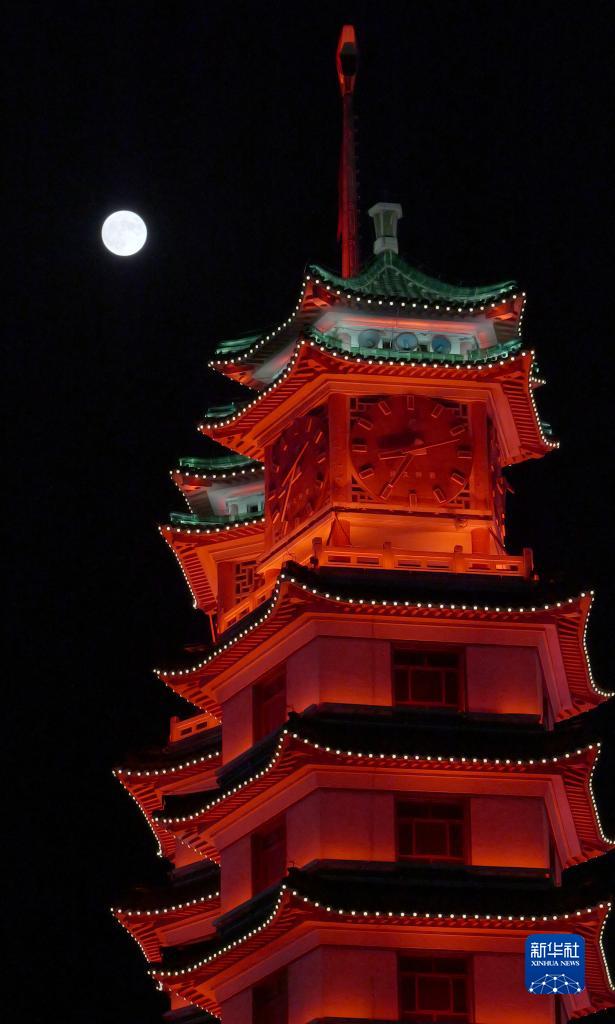 這是9月29日在河南省鄭州市二七紀念塔附近拍攝的月亮。