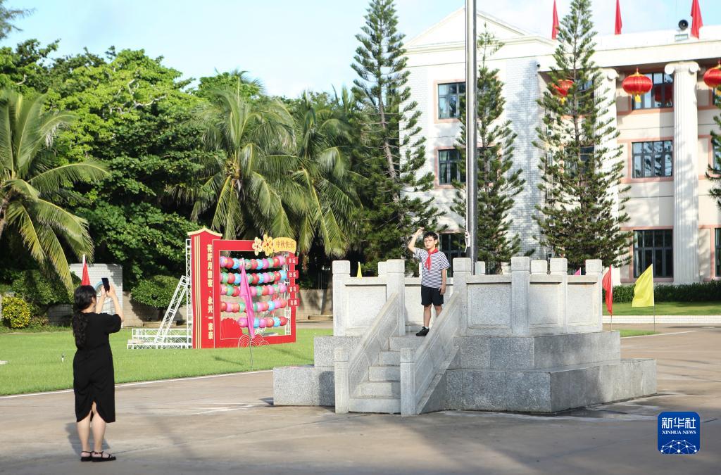 10月1日,參加升旗儀式的群眾在海南省三沙市政府大樓前廣場拍照留念。