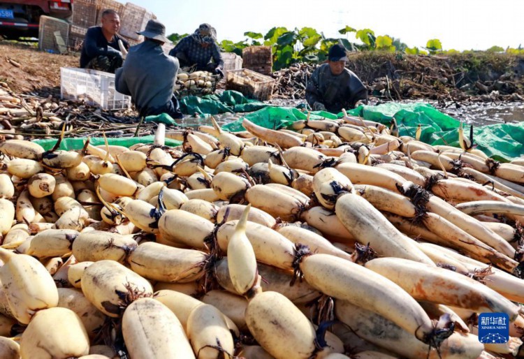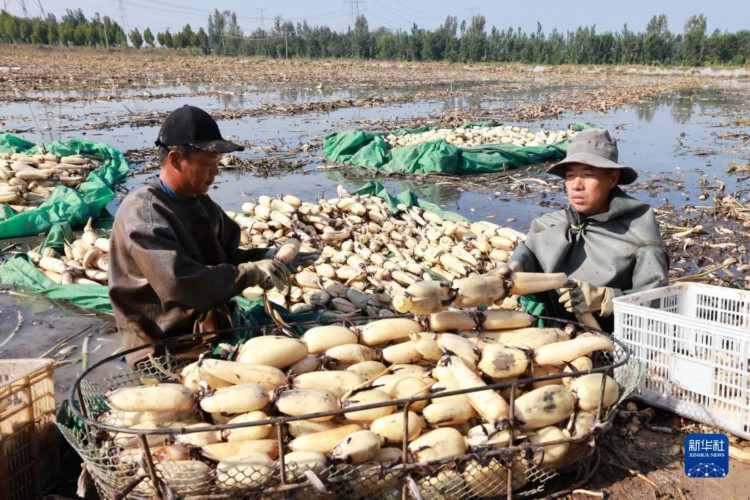 10月5日,河北省新河縣西流鄉(xiāng)西董村一家蓮藕種植合作社的社員在收獲蓮藕。 近年來,河北省新河縣以水系相互連通和優(yōu)質(zhì)水域生態(tài)為依托,引導(dǎo)農(nóng)民采取“公司+合作社+基地+農(nóng)戶”的模式,因地制宜發(fā)展淺水蓮藕種植,帶動(dòng)當(dāng)?shù)剞r(nóng)民增收,助力鄉(xiāng)村振興。 新華社記者楊世堯攝