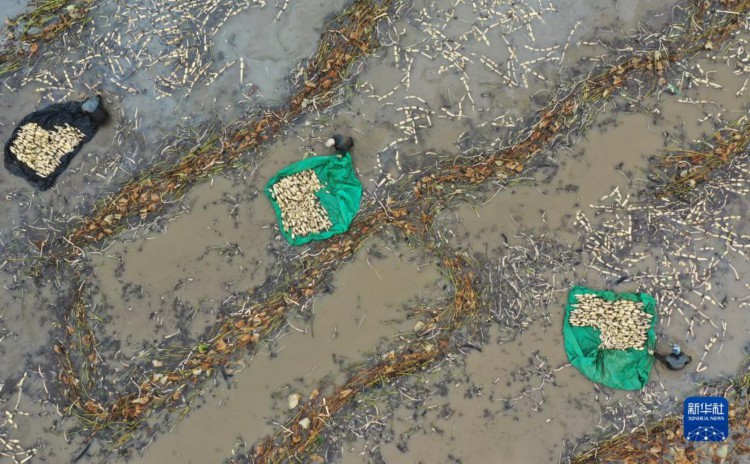 10月5日,河北省新河縣西流鄉(xiāng)西董村一家蓮藕種植合作社的社員在收獲蓮藕(無人機(jī)照片)。 近年來,河北省新河縣以水系相互連通和優(yōu)質(zhì)水域生態(tài)為依托,引導(dǎo)農(nóng)民采取“公司+合作社+基地+農(nóng)戶”的模式,因地制宜發(fā)展淺水蓮藕種植,帶動(dòng)當(dāng)?shù)剞r(nóng)民增收,助力鄉(xiāng)村振興。 新華社記者楊世堯攝
