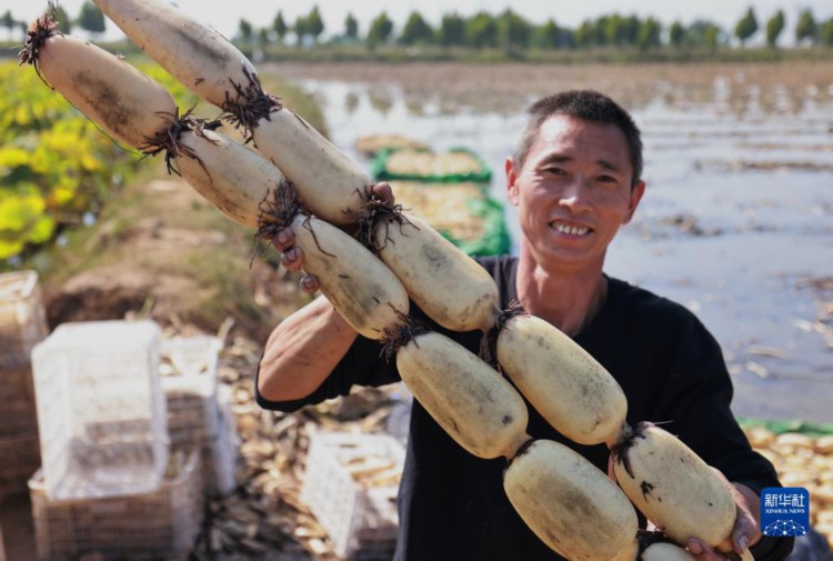 10月5日,河北省新河縣西流鄉(xiāng)西董村一家蓮藕種植合作社的社員在展示收獲的蓮藕。 近年來,河北省新河縣以水系相互連通和優(yōu)質(zhì)水域生態(tài)為依托,引導(dǎo)農(nóng)民采取“公司+合作社+基地+農(nóng)戶”的模式,因地制宜發(fā)展淺水蓮藕種植,帶動(dòng)當(dāng)?shù)剞r(nóng)民增收,助力鄉(xiāng)村振興。 新華社記者楊世堯攝