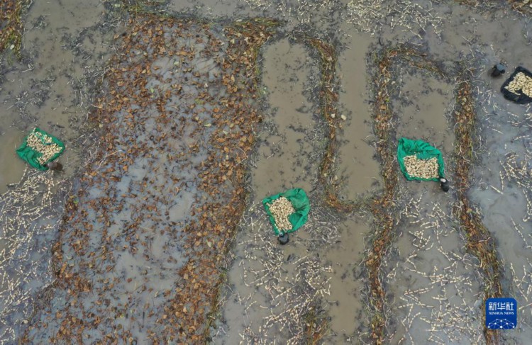 10月5日,河北省新河縣西流鄉西董村一家蓮藕種植合作社的社員在收獲蓮藕(無人機照片)。