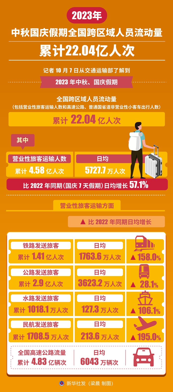 新華社北京10月7日電(記者 葉昊鳴)記者7日從交通運輸部了解到,2023年中秋、國慶假期,全國跨區域人員流動量(包括營業性旅客運輸人數和高速公路、普通國省道非營業性小客車出行人數)累計22.04億人次。其中,營業性旅客運輸人數累計4.58億人次,日均5727.7萬人次,比2022年同期(國慶7天假期)日均增長57.1%。