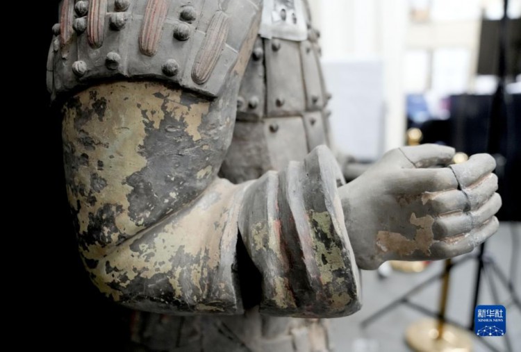 這是秦俑身上彩繪還原修復后的樣貌(8月23日攝)。