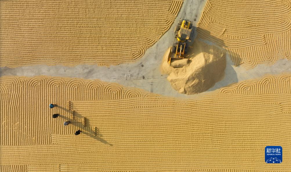 10月12日,在燈塔市禾谷茂源水稻種植專業合作社,農民在晾曬收獲的水稻(無人機照片)。