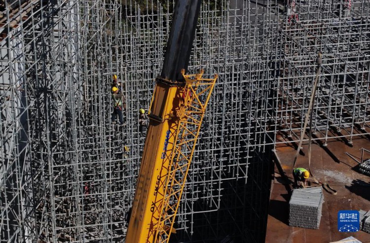 10月17日,工人在唐山灤州市內的秦唐高速公路建設工地施工(無人機照片)。