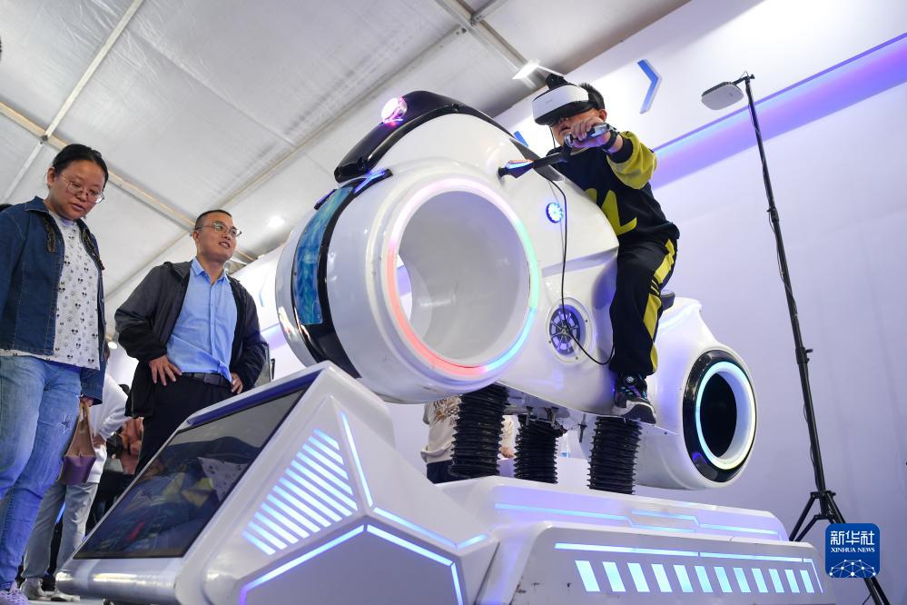 10月21日,小朋友在2023世界物聯網博覽會活動現場體驗智能娛樂設備。