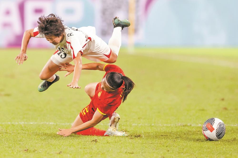 面對不久前獲得杭州亞運會亞軍的朝鮮隊,中國女足主教練水慶霞對陣容進行了較大調整,在海外效力的張琳艷和李夢雯都未首發出場。朝鮮隊在開場不到5分鐘就取得領先,7號球員丞香心禁區內推射得手。