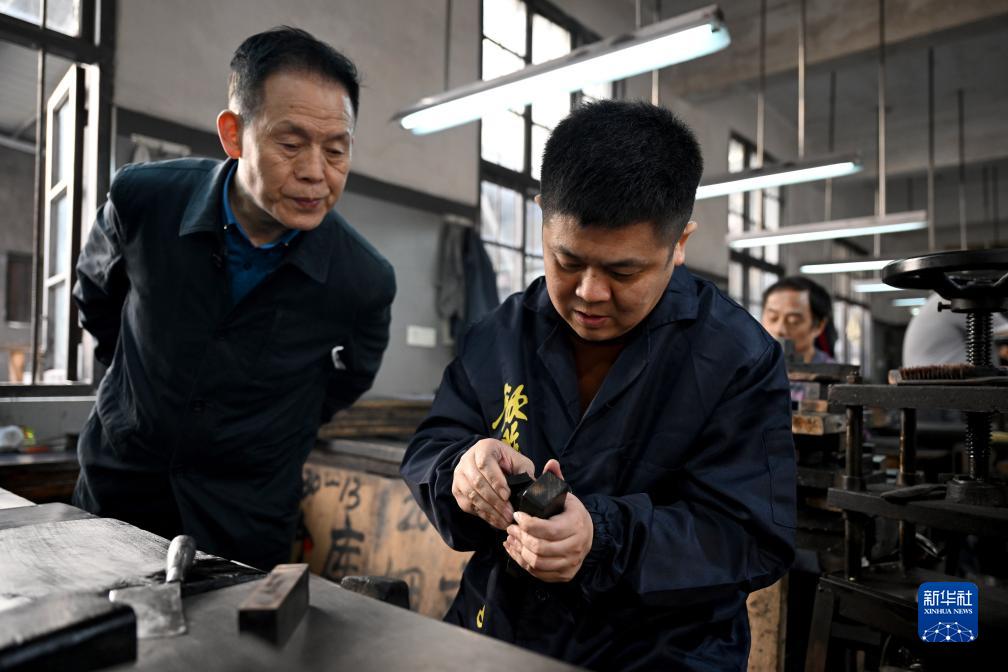 10月24日,在安徽省黃山市歙縣老胡開(kāi)文墨業(yè)有限公司,周健(右)在父親周美洪的注視下從墨模中取出壓制好的墨。
