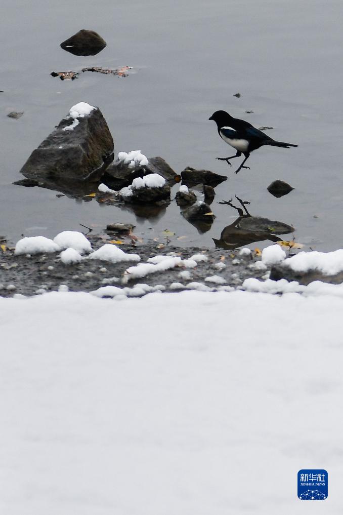 11月1日,在吉林長春,一只小鳥在湖面積雪的石頭間跳躍。