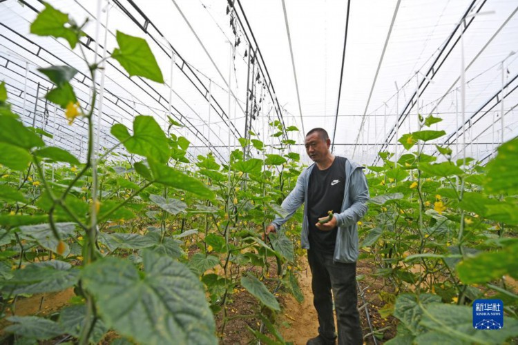 11月2日,在天津市西青區辛口鎮當城村,農戶在大棚內查看黃瓜的生長情況。