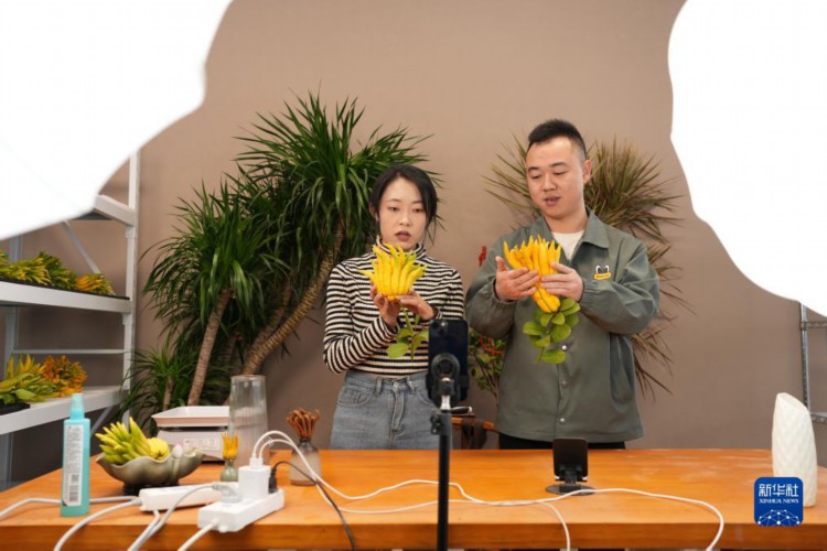 11月13日,在金華市婺城區羅店鎮金佛手果園共富工坊,工作人員在直播推銷佛手。
