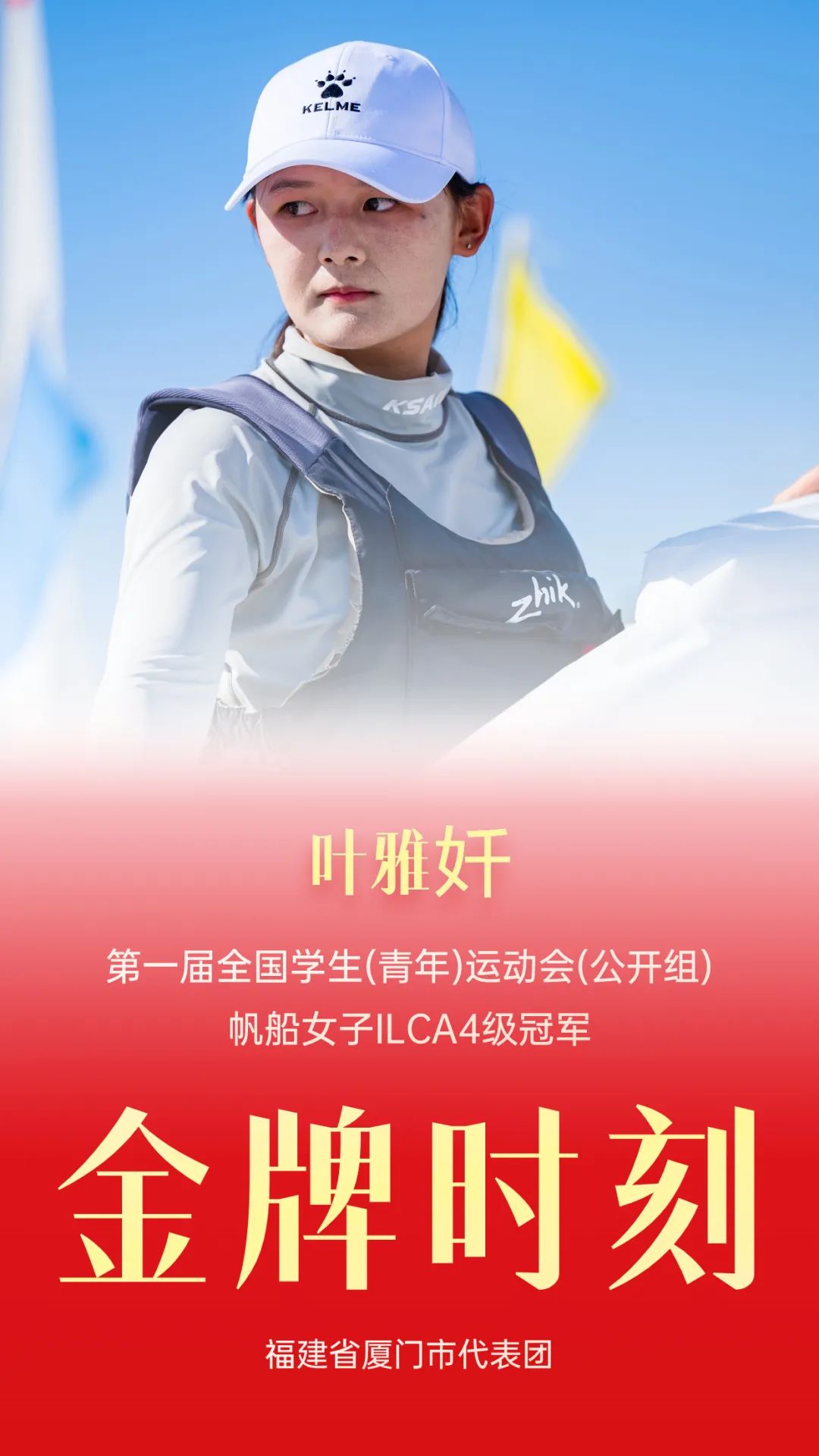 11月13日,在第一屆全國學生(青年)運動會(公開組)帆船比賽項目中,代表福建省廈門市參賽的運動員葉雅奷奪得帆船女子ILCA4級冠軍,這也是福建在本屆學青會(公開組)取得的第29枚金牌。