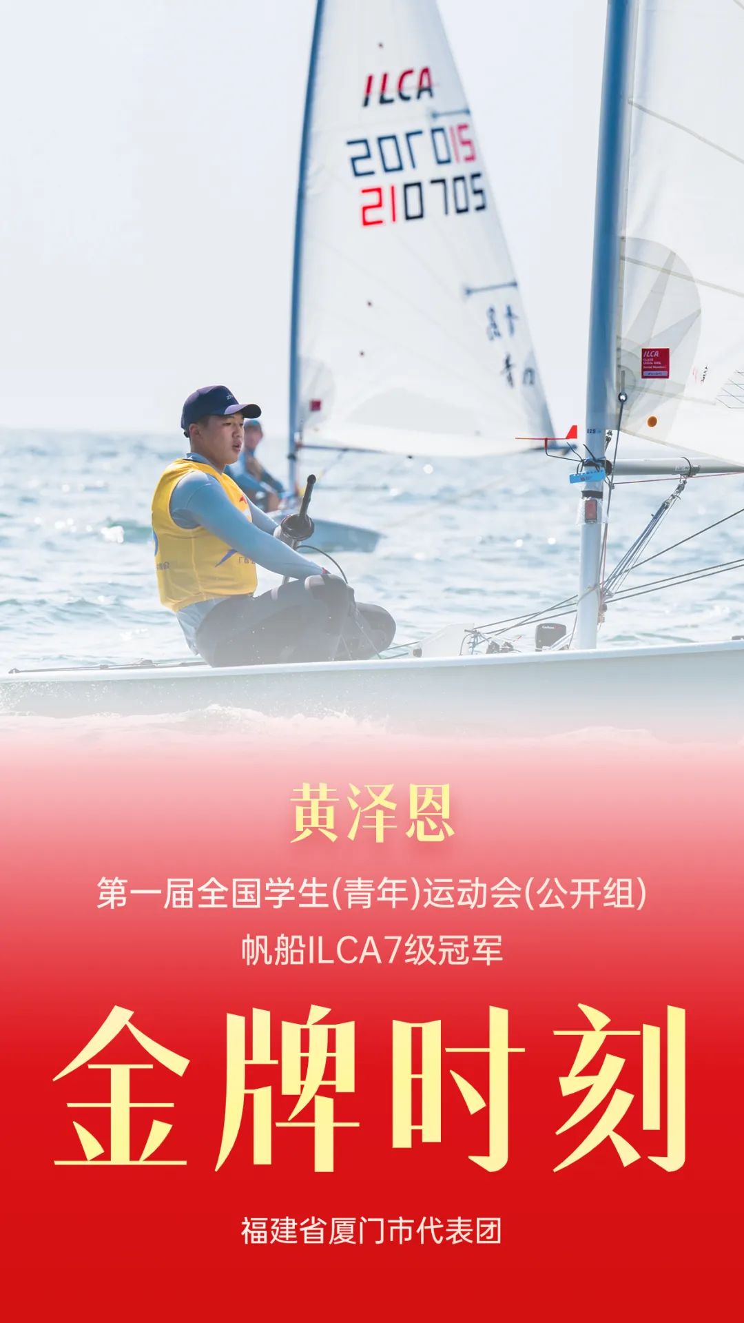 11月13日中午,在第一屆全國學生(青年)運動會(公開組)帆船比賽項目中,代表福建省廈門市參賽的運動員黃澤恩在完成6天的決賽中奪得帆船ILCA7級冠軍,這也是福建在本屆學青會(公開組)取得的第27枚金牌。