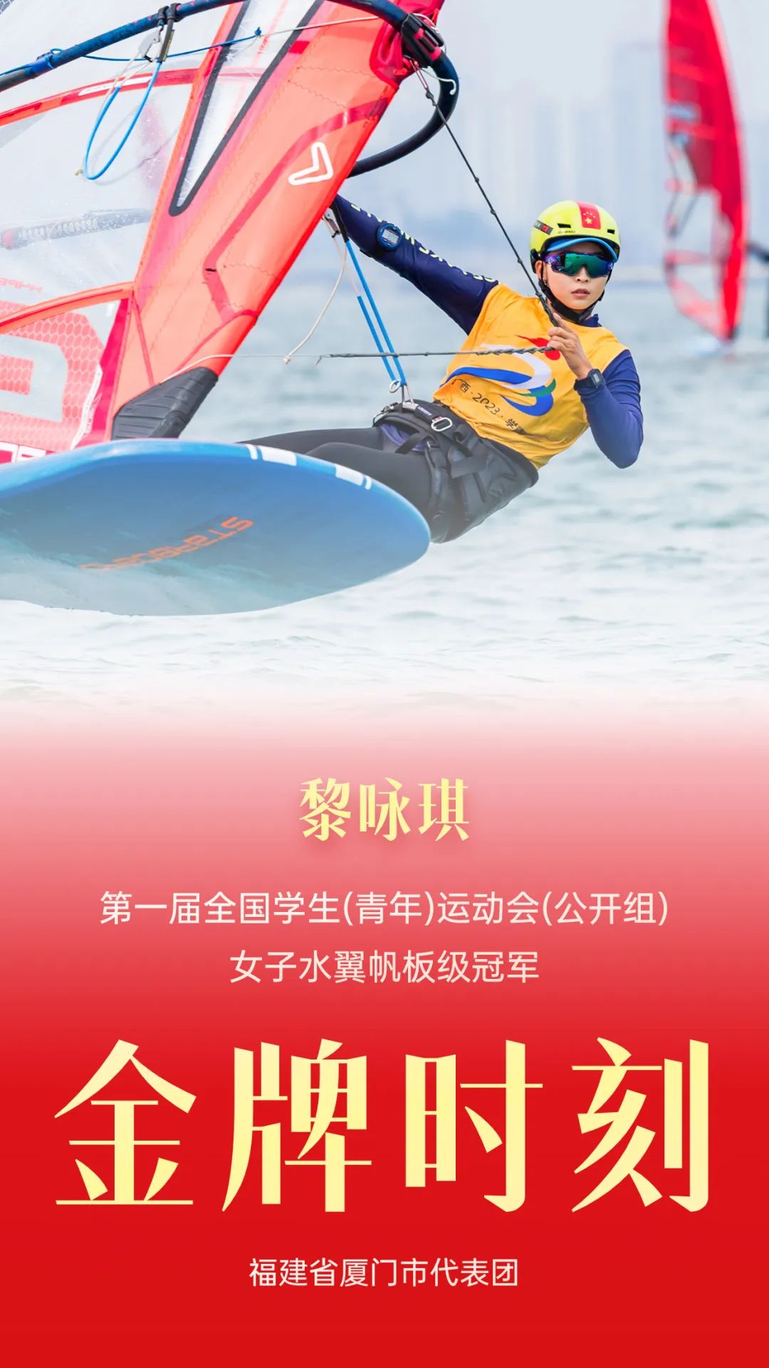 11月13日,在第一屆全國學生(青年)運動會(公開組)帆船比賽項目中,代表福建省廈門市參賽的運動員黎詠琪獲得女子水翼帆板級冠軍,這也是福建在本屆學青會(公開組)取得的第30枚金牌。