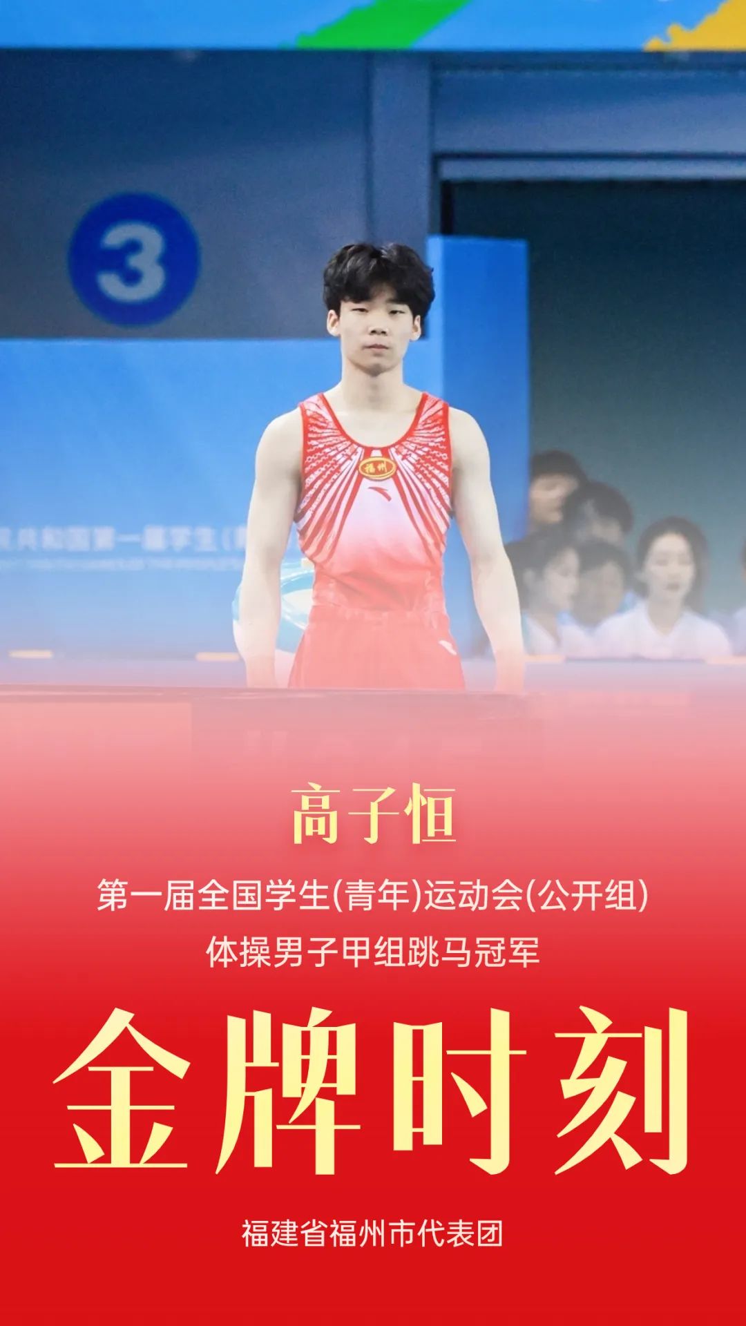 11月13日,在第一屆全國學生(青年)運動會(公開組)體操男子甲組跳馬決賽中,代表福建省福州市參賽的運動員高子恒以13.966分奪得該項目金牌,這也是福建在本屆學青會(公開組)取得的第32枚金牌。
