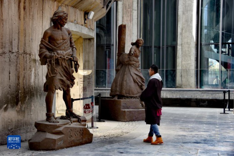 11月15日,觀眾在西藏美術館參觀雕塑作品。