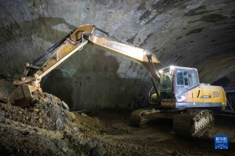 11月19日,中鐵五局施工人員操作挖機在桑龍高速金家坡二號隧道內(nèi)施工。 新華社記者 陳思汗 攝