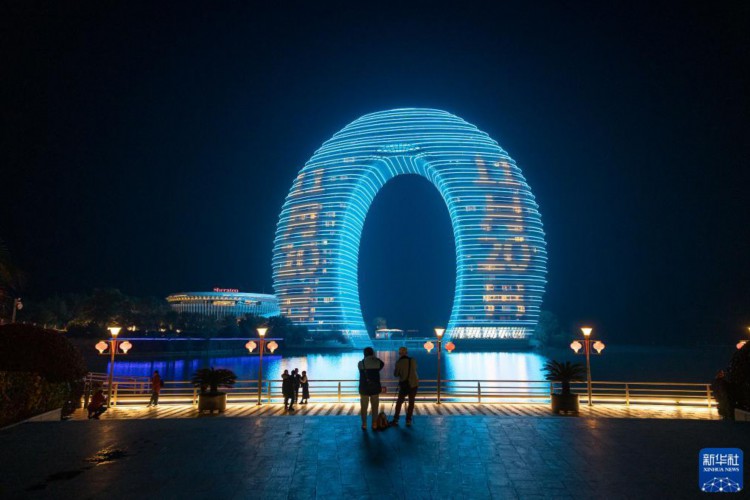 11月20日,人們?cè)谡憬『菔心咸聟^(qū)月亮灣欣賞為世界兒童日亮燈的當(dāng)?shù)氐貥?biāo)建筑。