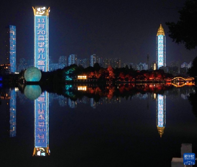 11月20日,浙江省溫州市地標性建筑世貿中心大廈和置信大廈為世界兒童日亮燈。