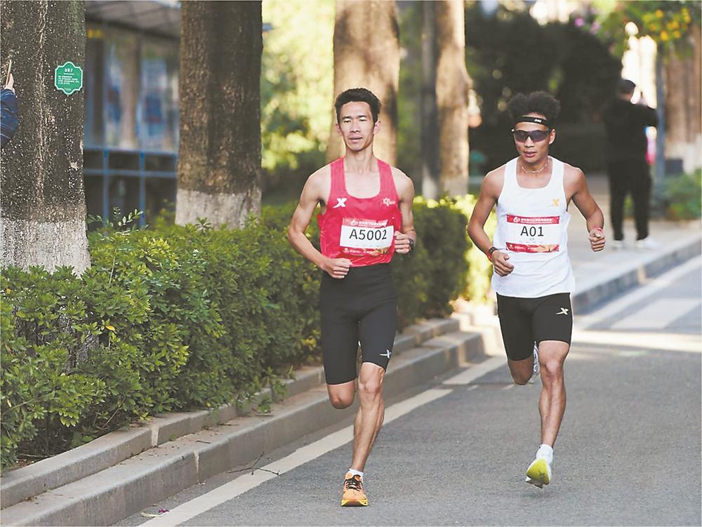 前不久創(chuàng)造全國(guó)馬拉松紀(jì)錄的名將何杰(右)也亮相比賽。(主辦方供圖)