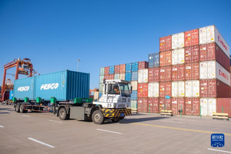 11月22日,裝載集裝箱的卡車行駛在溫州港狀元岙集裝箱碼頭內。 近年來,浙江省溫州港通過完善港區內基礎設施、提升港口開放能級、助力臨港產業培育等措施,實現溫州港港口貨物吞吐穩步增長。截至2023年10月,溫州港已完成貨物吞吐量7236.96萬噸,同比增長4.25%。 新華社記者 江漢 攝
