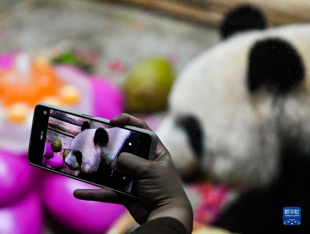 當日,為慶祝大熊貓“貢貢”和“舜舜”來到海南五周年,位于海口的海南熱帶野生動植物園為這對“熊貓兄弟”準備了玩具和竹筍、水果等美食,同時舉辦多種科普活動和互動游戲,吸引不少游客參加。